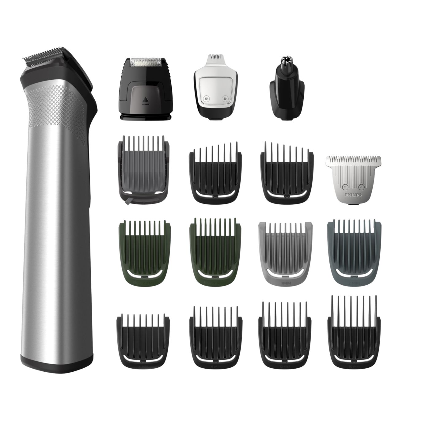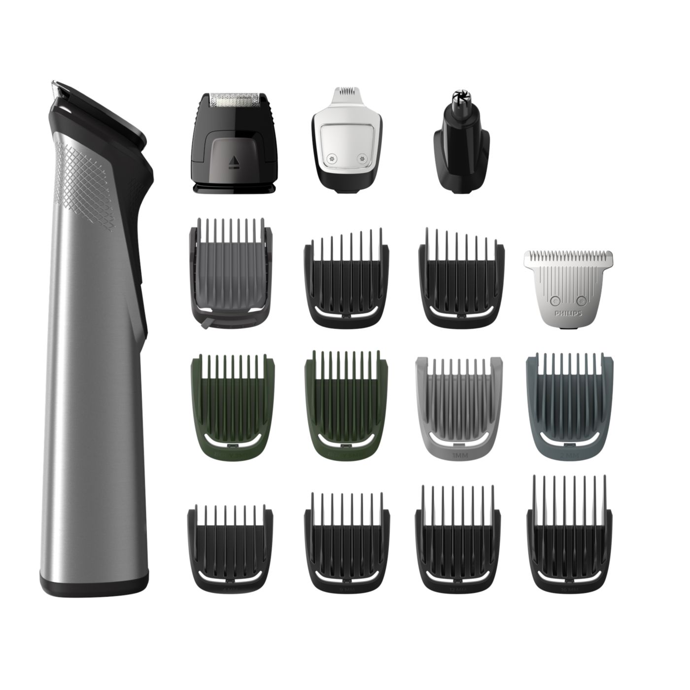 23 pieces for all your trimming needs: a metal trimmer, a foil shaver, a detail metal trimmer, a nose and ear trimmer, an extra-wide hair trimmer, 6 hair trimming guards, 3 beard trimming guards, 2 stubble trimming guards, 2 body trimming guards, an eyebrow trimming guard, a storage bag and a cleaning brush.